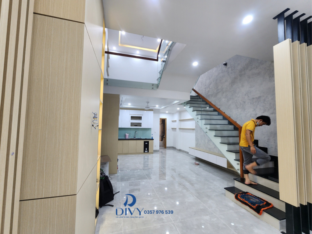 Cầu thang được thiết kế với kính cường lực và tay vịn gỗ, vừa đảm bảo an toàn vừa tạo sự thông thoáng. Đây là xu hướng phổ biến trong các công trình xây dựng trọn gói Phú Mỹ Vũng Tàu hiện nay.