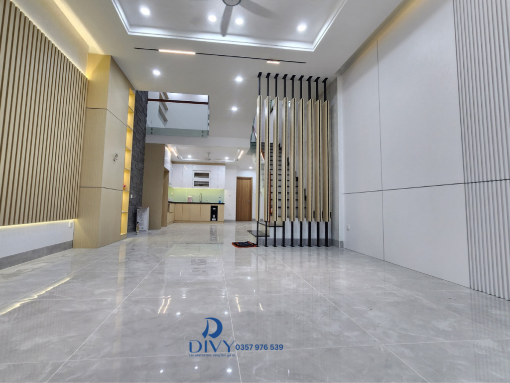 Phòng khách được thiết kế mở, liên thông với khu vực bếp phía sau. Sàn nhà sử dụng gạch bóng màu xám giúp phản chiếu ánh sáng, tạo cảm giác rộng hơn so với diện tích thực.